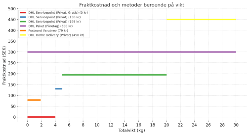 Vi erbjuder kostnadsfri frakt för beställningar där ordervärdet överstiger 3000kr. Kostnadsfri frakt via DHL Service Point erbjuds annars alltid för beställningar som väger max 4kg.